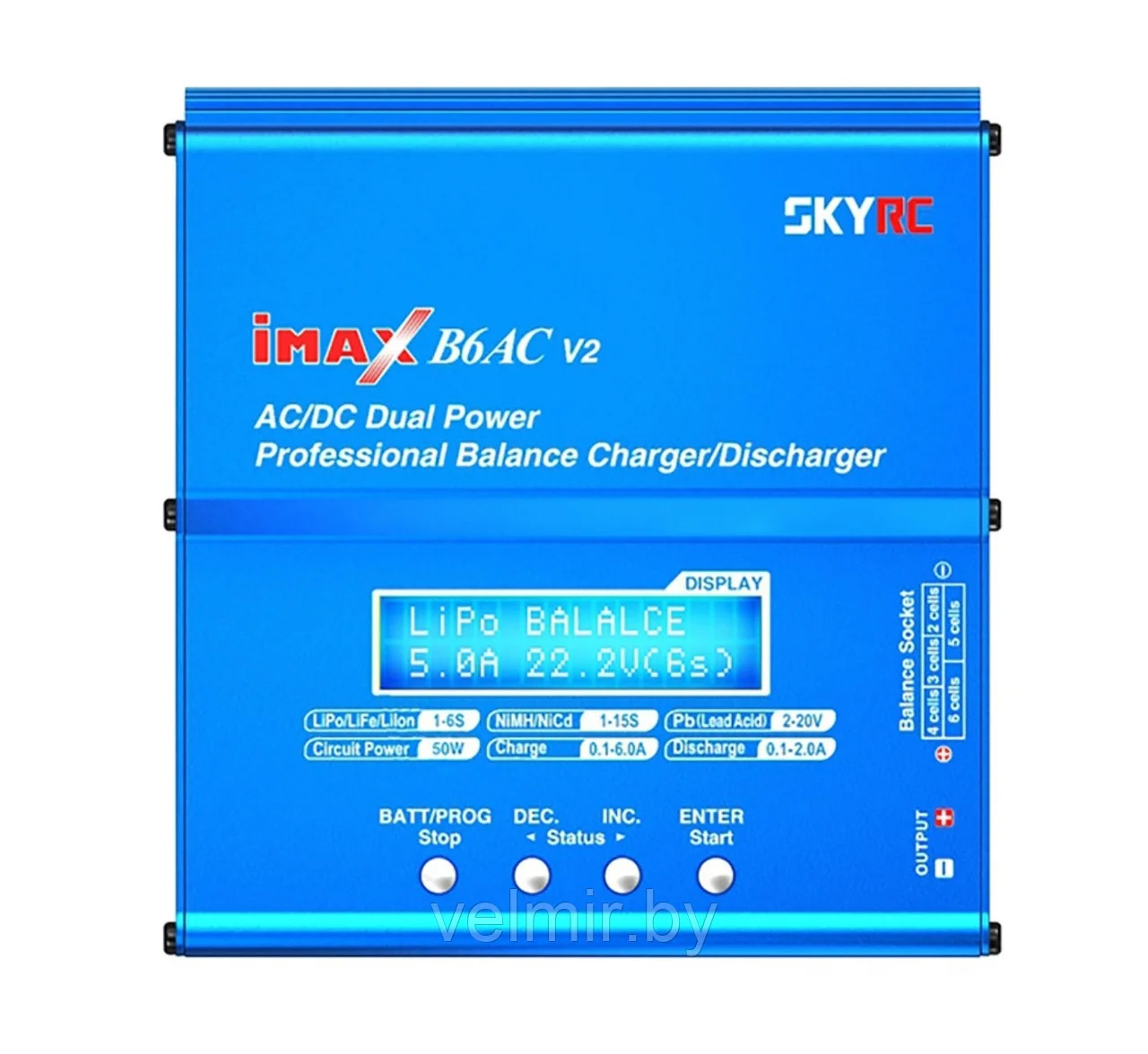 Универсальное зарядное устройство SkyRC iMAX B6AC v2 Professional Balance Charger/Discharger - это высококачественное зарядно-разрядное устройство создано для зарядки и обслуживания всех современных типов аккумуляторов. Специальные разъёмы для балансировочной зарядки Li-ion аккумуляторов позволяют сбалансировать вольтаж на каждой банке, в итоге обеспечивается долгий срок службы и максимальное время работы модели от аккумулятора. SkyRC iMAX B6AC v2 работает как от сети 220 В, так и от источника постоянного напряжения 11-18 (например от аккумулятора автомобиля). От предыдущего поколения B6AC (без V2) отличается повышенной силой тока заряда (до 6А), и возросшей силой тока разряда (до 2А).